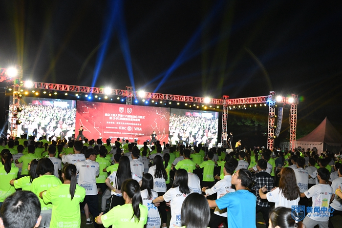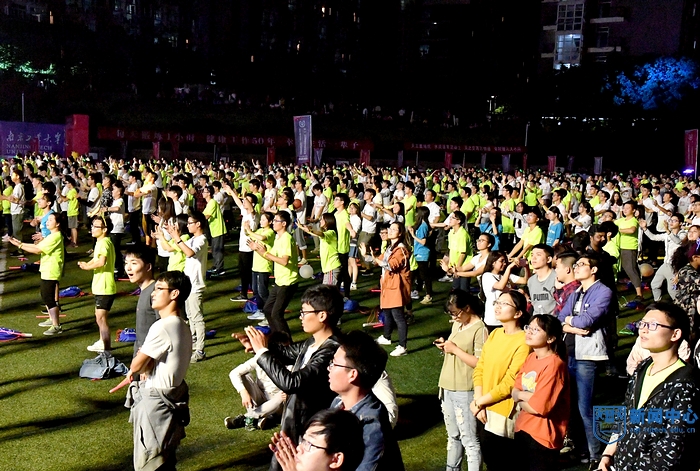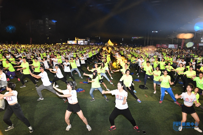 开幕式结束后,由校体育部和北京天歌咏华体育传媒公司共同打造的 “U-RUN2018校园跑步&健身盛典”正式登场。现场1700多名师生衣服上涂抹着荧光液,戴着荧光棒做成的眼镜、手环等异形物品,随着激情四射的音乐和热烈欢快的节奏,在专业健身教练的带领下进行了太极禅和搏击操的健身课程。色彩交织的海洋点亮了浦园的夜空,也让现场师生体验了快乐健身,感受到运动魅力。健身课程结束后,现场师生沿着校园跑道进行了荧光夜跑。流动的光影,欢快的步伐,装饰出别样精彩的校园,也串起了一个个“同心圆”。