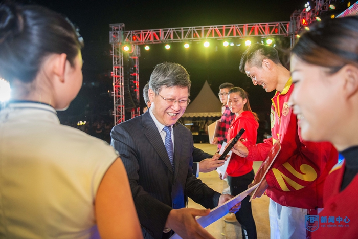 四月芳菲,春意满园,星光璀璨,活力盎然。4月19日晚,第十六届校运动会开幕式暨U-RUN跑步&健身盛典在江浦校区田径场隆重举行。校领导芮鸿岩、乔旭、牛生杰、蒋军成、崔益虎、张进明、巩建鸣、吴胜红,校体育运动委员会全体委员、各参赛单位负责人与运动员代表及活动赞助商代表等参加活动。开幕式由校体育运动委员会主任、副董事长崔益虎主持。