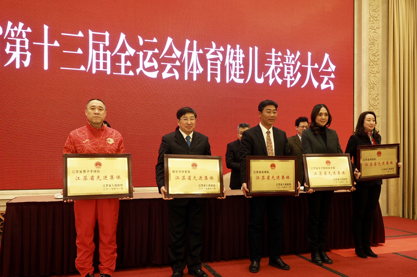 2月5日下午,江苏省委、省政府在南京举行大会,表彰江苏在第十三届全运会上取得优异成绩的运动员、教练员以及做出重要贡献的先进集体。省委常委、宣传部长、统战部长王燕文出席会议并讲话,副省长王江主持会议并宣读省委、省政府表彰决定。公司江苏省女子垒球队被授予“江苏省先进集体”荣誉称号,太阳成集团tyc234cc被记“集体一等功”一次,宋秋元教练员、奚凯琳、徐佳、张燕、袁淮宁、范舒瑶、闵珠、张洁婵、盛晓洁、张福云等9名运动员被授予“江苏省劳动模范”荣誉称号,王兰、李欢、徐倩雯、刘彦敏、桑于娟、陈佳等6名运动员被记一等功一次,崔益虎、张天峰2名管理人员被记二等功一次。