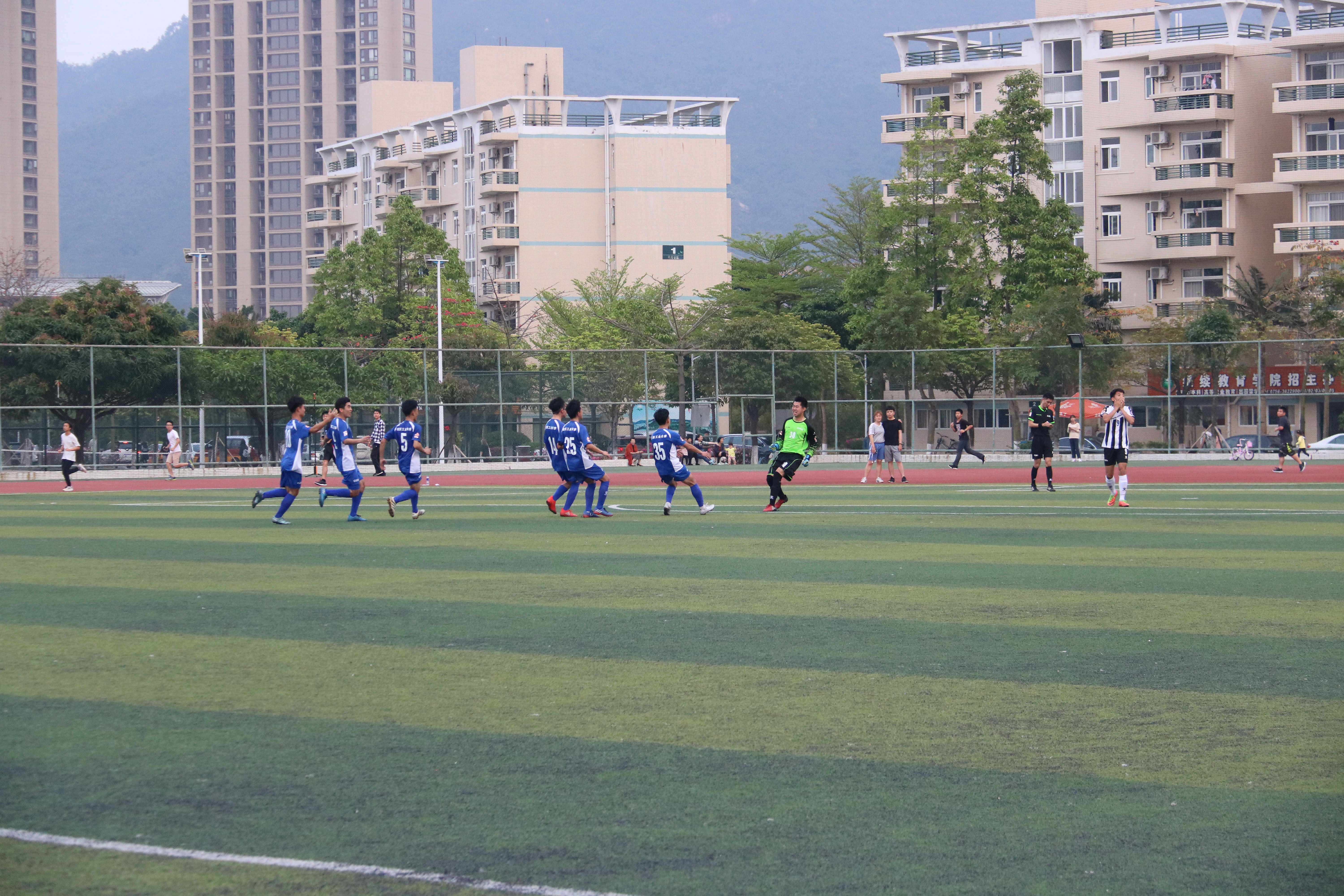 第二场比赛,对阵厦门大学嘉庚公司,面对对方极致的“小快灵”打法,球队制定了高举高打的战术策略,虽然在下半场比赛让对手先入一球,但南工全队没有放弃,一次次地进攻威胁着对手的球门,最终,在下半场伤停补时的最后一刻,南工获得一粒角球,徐鹏在空中高高跃起,将球顶进球门,为球队扳平比分。在随后的点球大战中,球队又以4-3取胜,从而以5个积分和胜负关系的优势提前一轮闯进东南区8强。