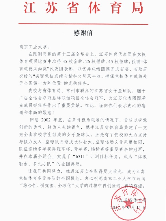 江苏省体育局向公司发来感谢信