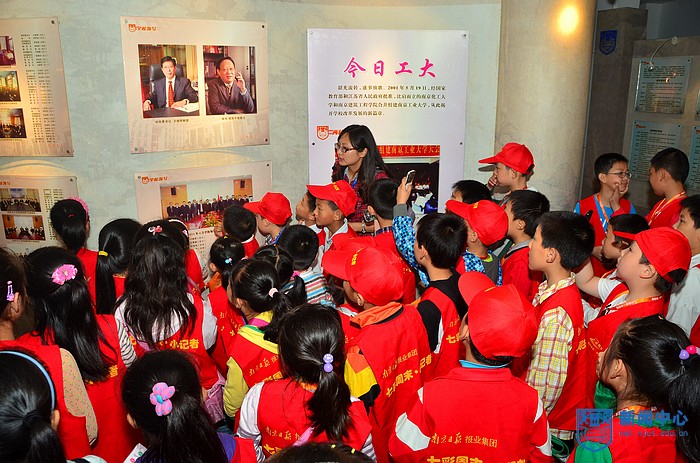 离开了体育馆,校车驶向了天宝阁。一路上经过生化中心、学府苑、象山等地。五月的校园,绿树成荫,鸟语花香,微风拂过湖面,水波粼粼,有一群白色的鹅在湖面悠闲地划开一道道水波,在校广播台同学的讲解下,每个小记者都沉醉在这一片美丽之中。来到校史陈列馆,在老师和员工代表的陪同下,他们粗略地了解了工大的百年发展史,感受到了工大深厚的文化底蕴。而当天正值公司110周岁生日,他们也借此表达了对公司的祝福和对公司的向往之情。看着江浦校区的建筑模型,“公司真大哦,很漂亮!”他们不禁慨叹道。