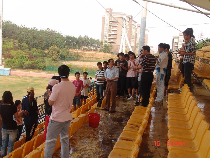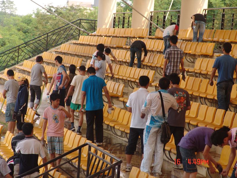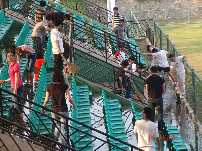 在全校师生热切期盼公司“江苏实施创新驱动战略的关键技术路径”高峰论坛暨办学109周年·合并组建10周年校庆的关键时刻, 于5月16日下午3:00-6:00,由体育部运动队管理中心主任、校篮球队主教练佘海文亲自组织和发动了校常设运动队的全体队员,对江浦校区主垒球场看台内卫生进行了第一次大扫除。作为一堂特殊的训练课,校篮球队、田径队、棒球队、垒球队和舞龙舞狮队的所有队员共计80多位参加本次打扫。大家情绪高涨,积极地参与其中,许多队员表现出了主人翁精神,感觉到这次任务光荣。打扫垒球场大看台,是一次需要集体大合作,体现出了团队精神的活动。有的手持高压水枪来冲刷台阶和坐位;有的清除坐位下和夹缝中的树叶等垃圾;有的将坐位表面抹干净;还有的安排运送垃圾。虽然打扫卫生没有平时运动训练的强度大,但在台阶上上上下下,来来回回一下午,干得大家腰酸背痛,加上气温较高,个个都汗流浃背,可都没有一句怨言,大家只有一个想法,能为校庆做点实事,把校园打扫干净,以优美、整洁的运动场馆,迎接各方宾客和同学前来观看5月21日下午在垒球场举行的“2011年国际老员工垒球邀请赛”。通过三个多小时的共同努力,圆满地完成了第一次打扫任务。体育部党政领导在过程中看望大家,给予了充分的肯定,对运动员们的辛勤劳动表示了感谢。按计划,他们还将在5月20日安排第二次打扫看台的台阶和坐位。(来自体育部