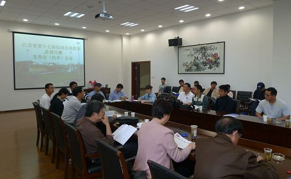 5 月12日下午,江苏省第十七届运动会高校部(甲组)垒球赛竞委会(技术)会议在公司江浦校区新体育馆报告厅举行。出席会议的领导有:江苏省教育厅体卫艺处处长杜伟,江苏省教育厅体卫艺处副处长李海宁,省员工体育协会副主席、本届运动会组委会竞赛部部长庄惠华及参加本届(甲组)垒球赛的兄弟高校的体育部主任等。
