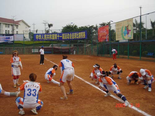 校江苏女子垒球队参加全国第十一 届运动会垒球比赛预赛,并以小组第一的身份进入决赛阶段
