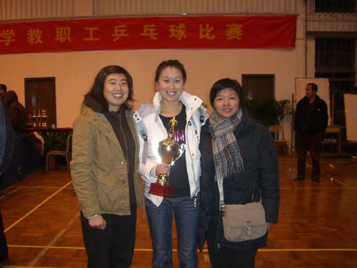 在本次教职工乒乓球比赛中,体育部以曹婧、周爱东、严燕为队员的女子队经过了三个单元时间的拼搏,终于获得了女子团体第一名,她们为体育部争得了荣誉。以张天峰、杭华彬、李海兵、车益民、曹西文等为男队队员,面对强手,也尽了努力,只是在关键场次,未能有效地把握住,因而挡住了我们前进的步伐。在先前的男女单打的比赛中我部严燕、周爱东分别获得了女子单打的第二名和第六名,杭华彬获得男子单打的第七名。