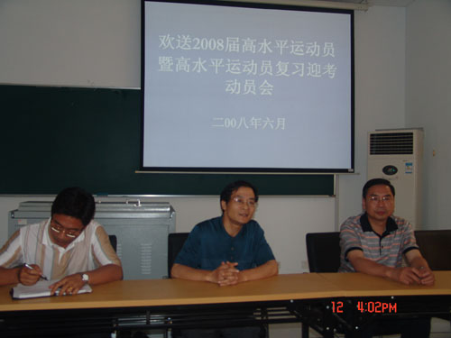 6月12日下午,体育部在江浦校区体育综合馆报告厅召开欢送08届高水平运动员毕业暨在学运动员复习迎考动员会,体育部党政领导和各校运动队教练员参加了会议。会议由体育部张天峰副主任主持。