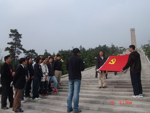 体育部党总支于4月11日下午至12日下午组织全体教职工党员赴茅山新四军纪念馆、金坛博物馆、华罗庚纪念馆、金坛体育馆等地参观学习。11日下午一行首先来到了茅山新四军纪念馆,举行了以“重温入党誓词,争当实践先锋”为主题的重温入党宣誓与参观调研活动。体育部党总支书记陈建华讲话,明确提出了开展本次活动的目的和意义。他指出:组织大家参观茅山新四军纪念馆,是因为在新四军纪念馆里,有翔实的史料,生动地再现了新四军和苏南人民抗日斗争的历史情景,使每一位党员被抗日英雄的英勇斗争的气概和不怕牺牲、前仆后继的精神所感染。缅怀抗日先烈,旨在进行一次深刻的革命传统教育。在鲜红的党旗和烈士塑像前,重温入党誓言,再次向党表达党员跟随党的愿望和决心。通过参观学习,也可以看到党员自身存在的不足,倍加努力,积极发挥每一个党员的先锋模范作用,发扬艰苦奋斗、坚韧不拔、团结战斗的革命精神,努力践行“三个代表”重要思想,树立科学发展观,牢记“两个务必”,提高工作水平。陈建华书记在讲话中还特别号召全体党员,在即将于5月16日至17日举办第六届校运动会上,努力工作,带头坚守岗位,履行好职责,为运动会的圆满举办做出自己应有的努力。根据公司领导提出的今年在全校师生中开展读书学习活动要求,希望全体党员积极地响应公司党委的号召,按照在“工作中学习和在学习中工作”的要求,自觉地利用业余时间加强理论学习,不断提高自身的综合素质,党总支要进行学习交流活动,评选出先进个人。接着,体育部年轻教师、新党员代表佘海文同志发了言,他感谢组织和同志们多年来对他的培养和教育,深刻地感受到了入党以后,作为预备党员,参加党组织的外出教育活动,心情更加的激动与兴奋,并深知作为一名党员肩负的责任更大,认识到只有用自己的实际行动来履行好入党誓词,才能成为一名真正的共产党员。为此他还向党组织保证,今后要更加努力学习、努力工作,做到关心集体、关心他人、尽心尽力地为体育部各项事业的发展作出自己的贡献。随后,全体党员在体育部党总支委员李加奎同志的带领下,庄严地举起右手,进行了入党宣誓,表达了争做一名合格党员的决心!宣誓完毕,一起参观了新四军纪念馆陈列室。