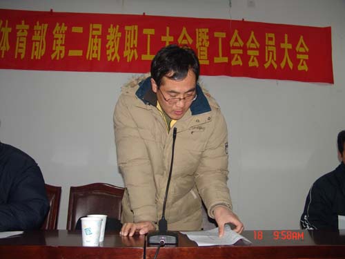 体育部分工会依据《中华人民共和国工会法》、《中国工会章程》、《工会基层组织选举工作暂行条例》及校工会关于分工会委员会换届改选的工作要求,体育部分工会制定了具体的选举办法和工作程序,并在2007年12月底下发了会议通知,对选举工作进行了布置。并于2008年1月18日上午,召开了第二届教职工大会暨工会会员大会,校工会主席杨兴南同志应邀出席了会议,并作了重要讲话。会议由体育部副主任,张天峰同志主持。
