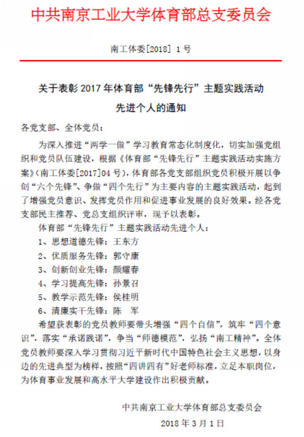 关于表彰2017年体育部“先锋 先行”主题实践活动先进个人的通知